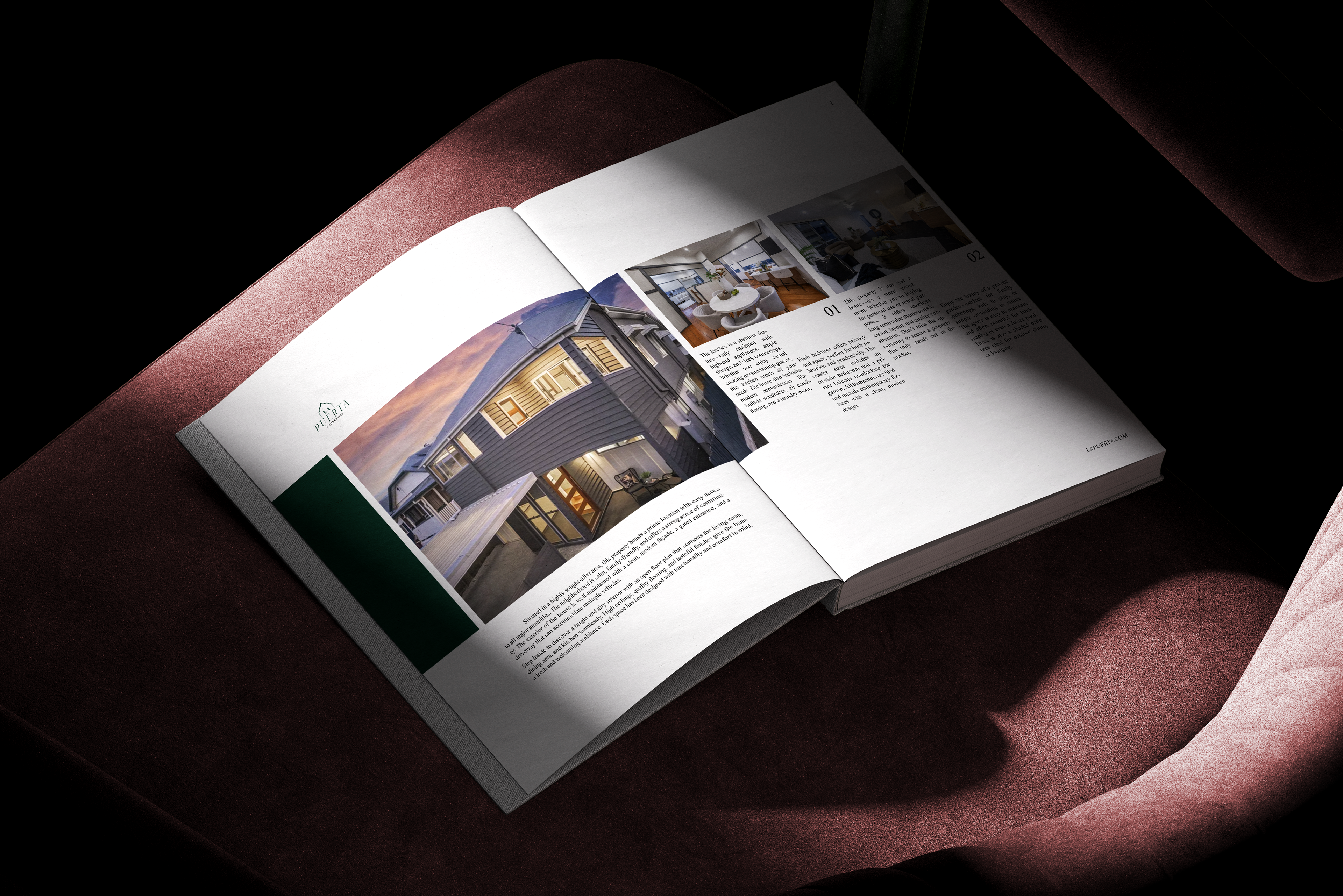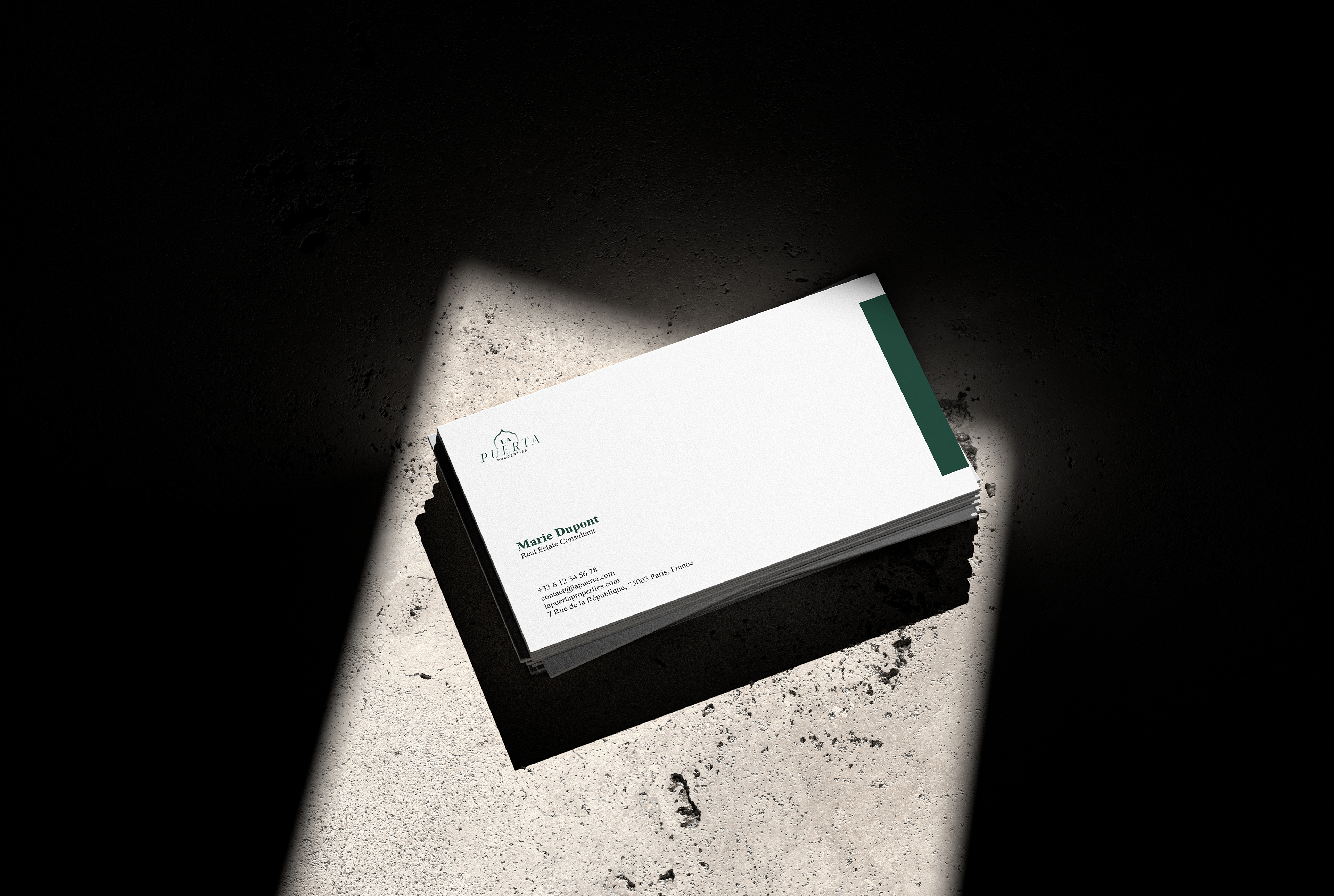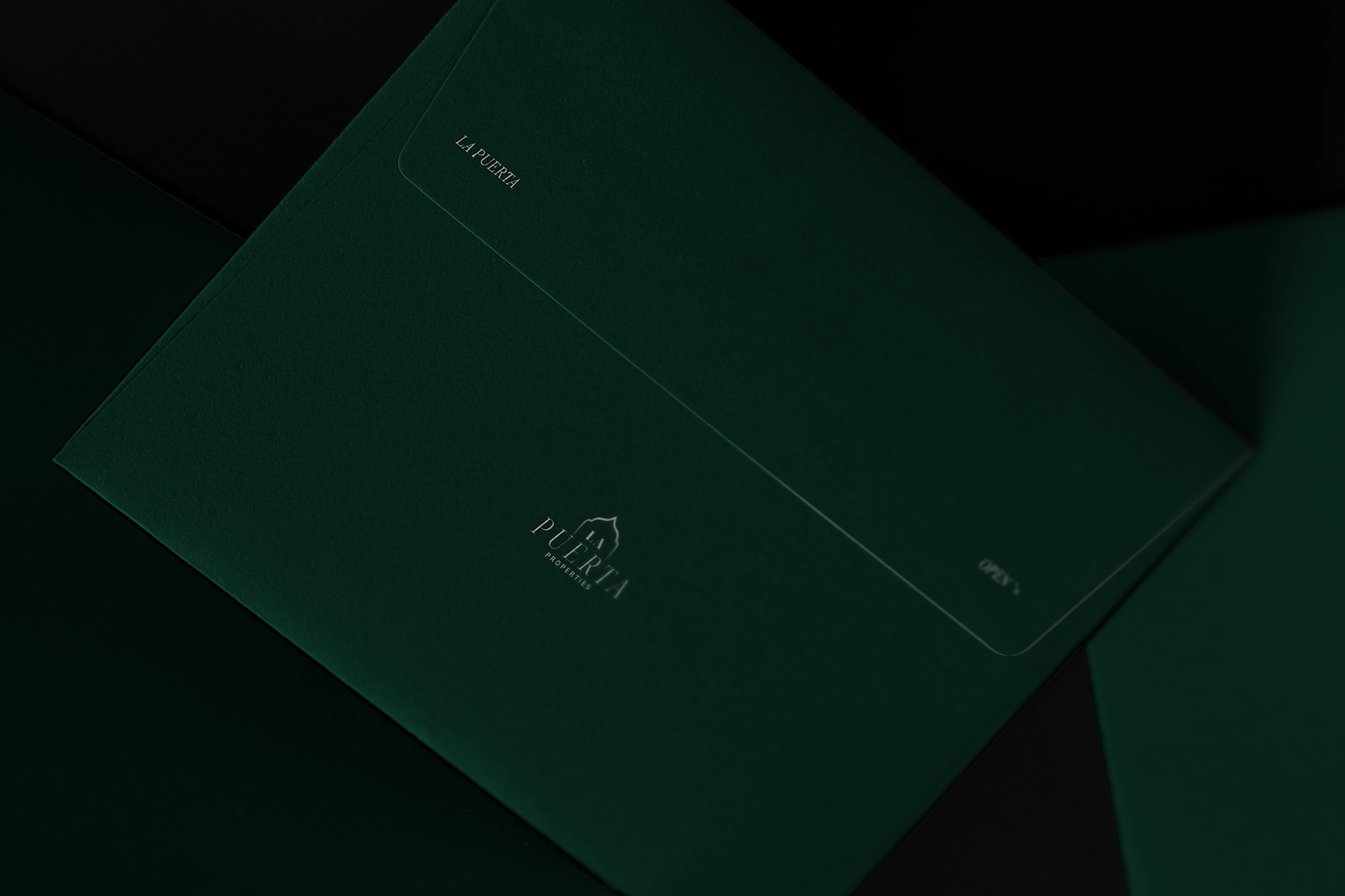 La stratégie de marque a été bâtie autour de la métaphore de « la porte » ( La Puerta ) — symbolisant l'accès, l'opportunité et la discrétion. Visuellement, l'identité de la marque a été développée pour refléter une élégance discrète.Un vert foncé et riche ($\#0\text{D}382\text{C}$) a été choisi comme couleur principale pour évoquer la stabilité et le prestige, associé à des accents d'or doux et d'ivoire pour créer du contraste et de la chaleur. La typographie a joué un rôle central, combinant un sérif élégant pour les titres avec un sans-sérif épuré pour le corps du texte, procurant un ton à la fois confiant et raffiné.Le résultat est un langage visuel qui communique l’exclusivité sans paraître inaccessible.